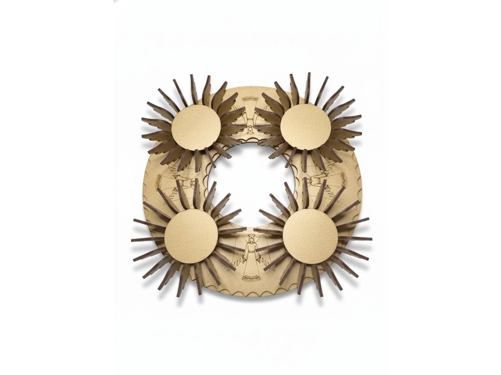 Originální dřevěný adventní věnec s jemně vygravírovanými anděly po celém obvodu a 3D křídly kolem čtyř svíček. Vzniká laserovým řezáním a ručním skládáním v malé dílně, takže každý kus je malý autorský kousek, ne sériová dekorace z řetězce.