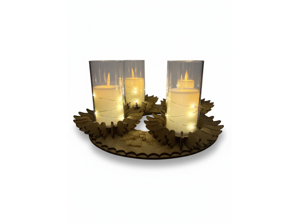 Dřevěný adventní svícen „Andělský kruh“ – klid a světlo Vánoc na vašem stole