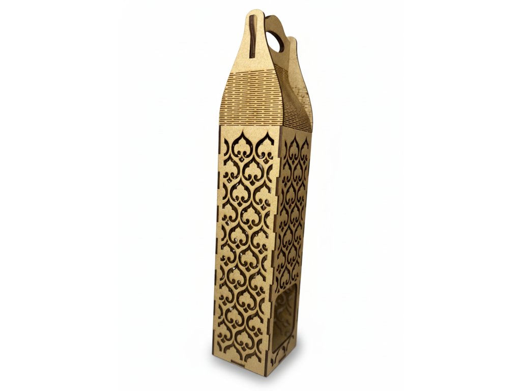 Box je vyroben z kvalitního dřeva a zdobený jemným laserovým výřezem, díky kterému je láhev částečně vidět a celý dárek působí luxusně a originálně. Praktické ucho nahoře usnadňuje přenášení a krabičku stačí jen doplnit lahví – žádné další balení už není potřeba.