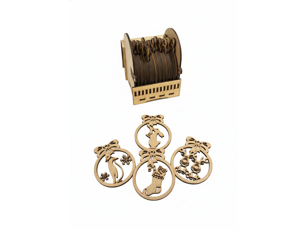 Každá ozdoba je ručně opracovaná a precizně vyřezaná laserem s detailními motivy mašliček, punčoch, zvířátek a vánočních symbolů.
